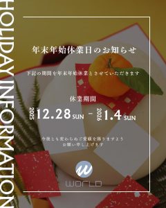 今年も1年、WORLDをご愛顧いただき、誠にありがとうございます。今年も、多くのお客様とのご縁に恵まれ、心より感謝申し上げます。たくさんのお客様と出会えたことを、大変うれしく思っております。